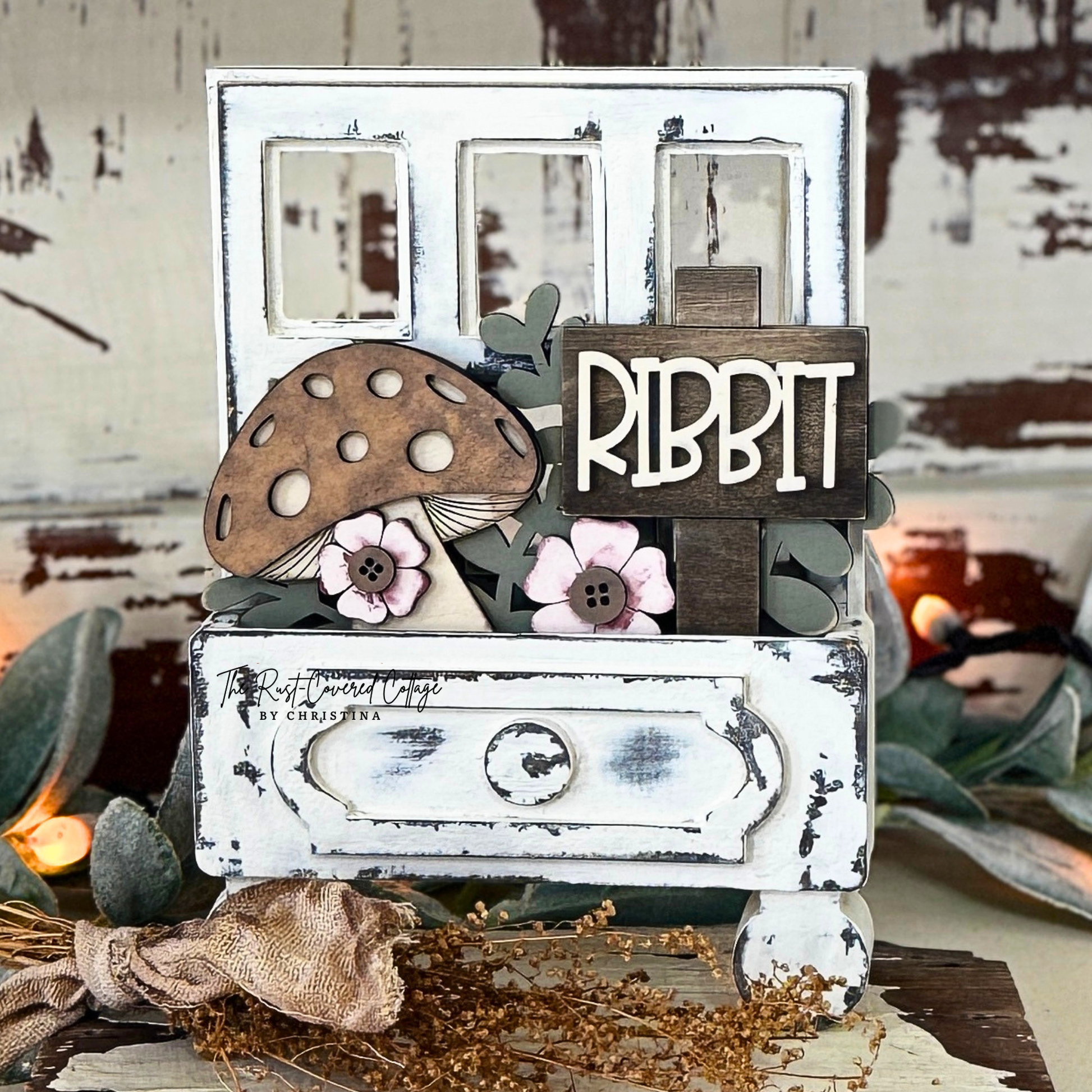 Add a whimsical cottage touch to your decorating with the Frog & Mushroom Cottage Drawer Insert. This coordinating layered design includes two playful nature-inspired inserts, featuring a cluster of mushrooms with cattails and florals, along with a mushroom accent and “RIBBIT” sign detail. It’s a fun addition to your Cottage Drawer display for spring and everyday cottage-style decorating.