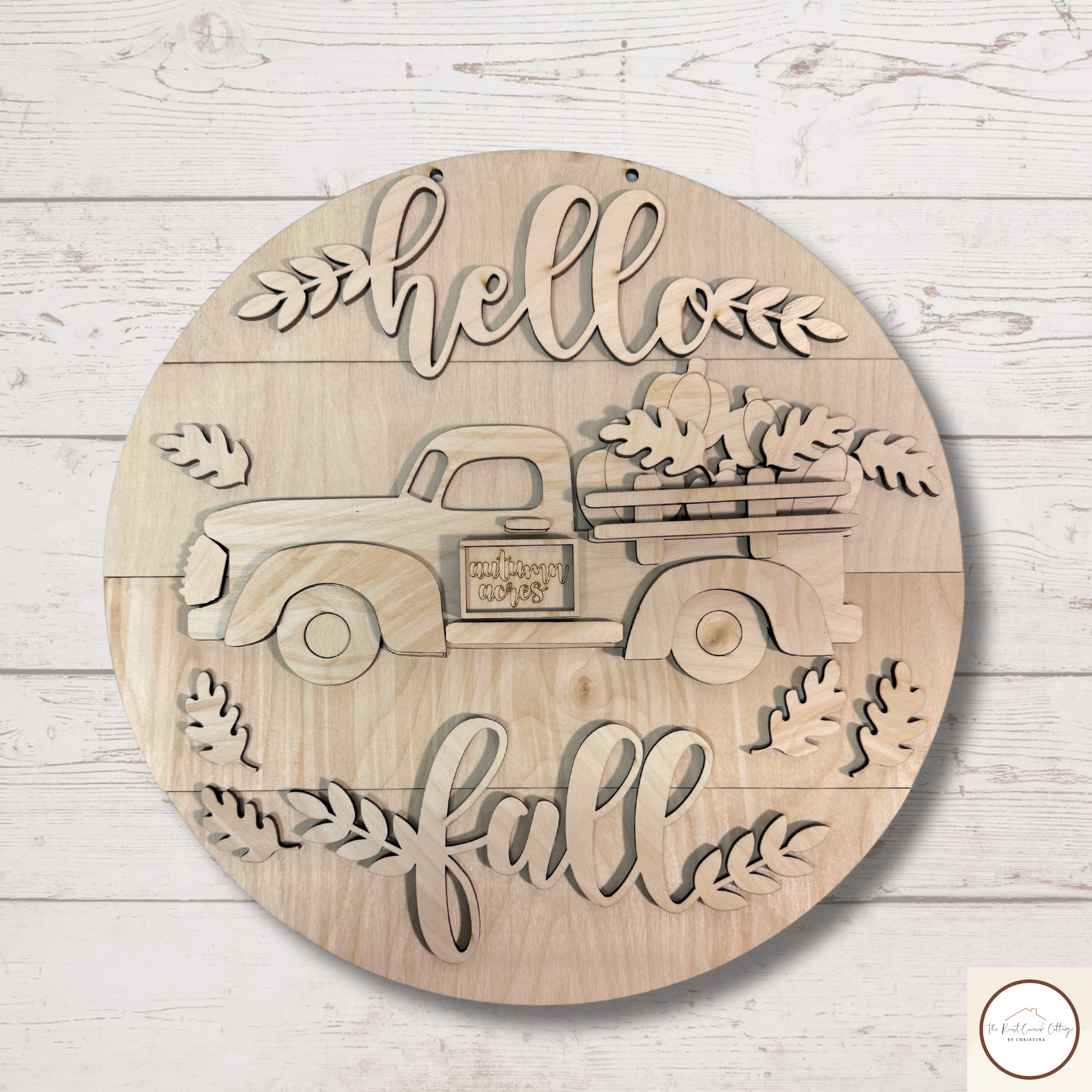 Welcome the cozy season with our "Hello Fall" Vintage Truck Sign DIY Wood Kit! This beautifully detailed sign is laser-cut from sturdy 1/4" Birch and measures 15" in diameter. Featuring a classic truck loaded with pumpkins and surrounded by autumn leaves, this sign captures the essence of fall. Perfect for decorating your home, porch, or any space that needs a touch of seasonal charm. Unfinished and ready for your creative touch, this kit is ideal for painting, staining, or customizing to fit your fall decor.