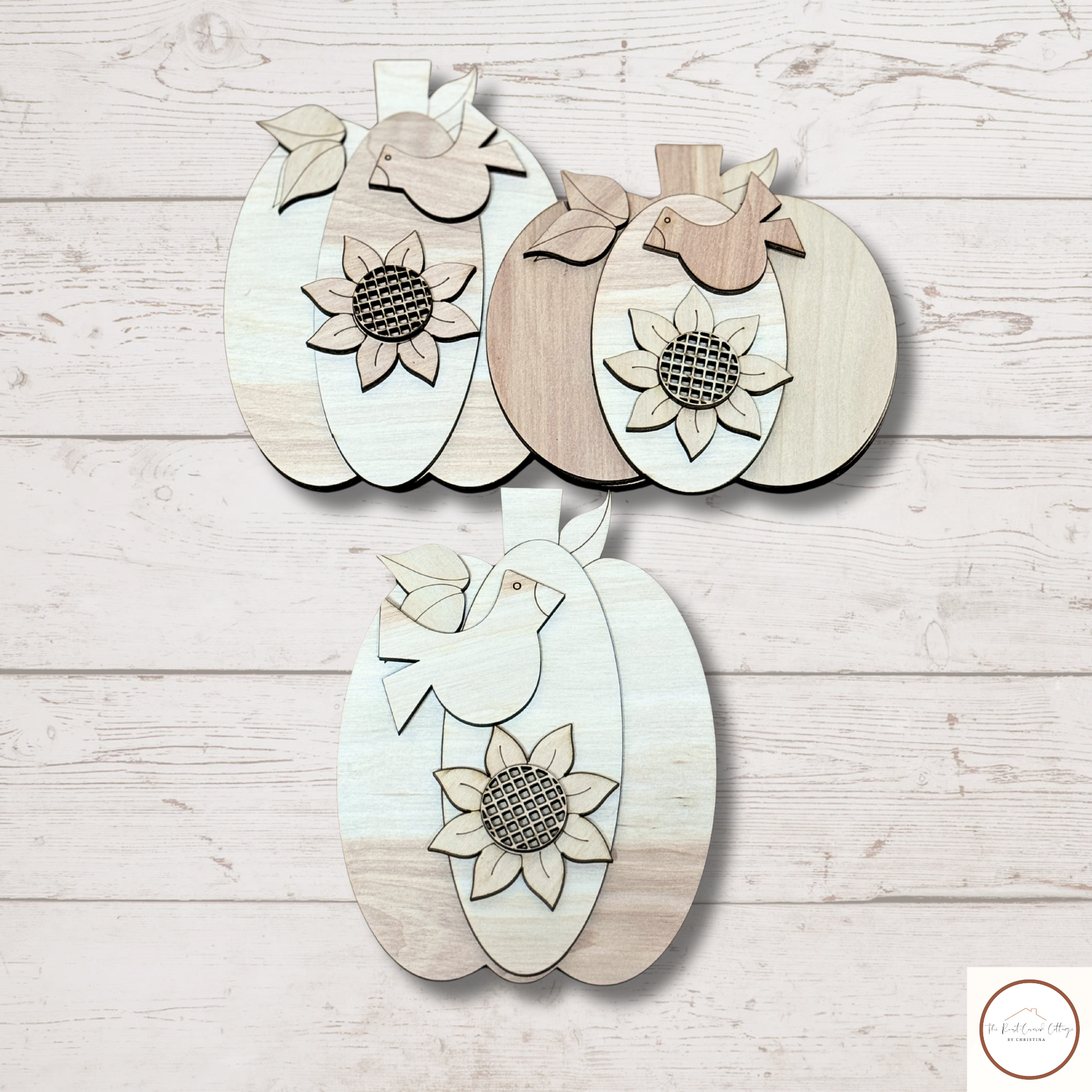 Bring the warmth of fall into your home with our handcrafted Layered Pumpkin Shelf Sitters! This rustic two-piece set is laser cut from 1/4" Birch and features dimensional details like a sunflower and perched bird.