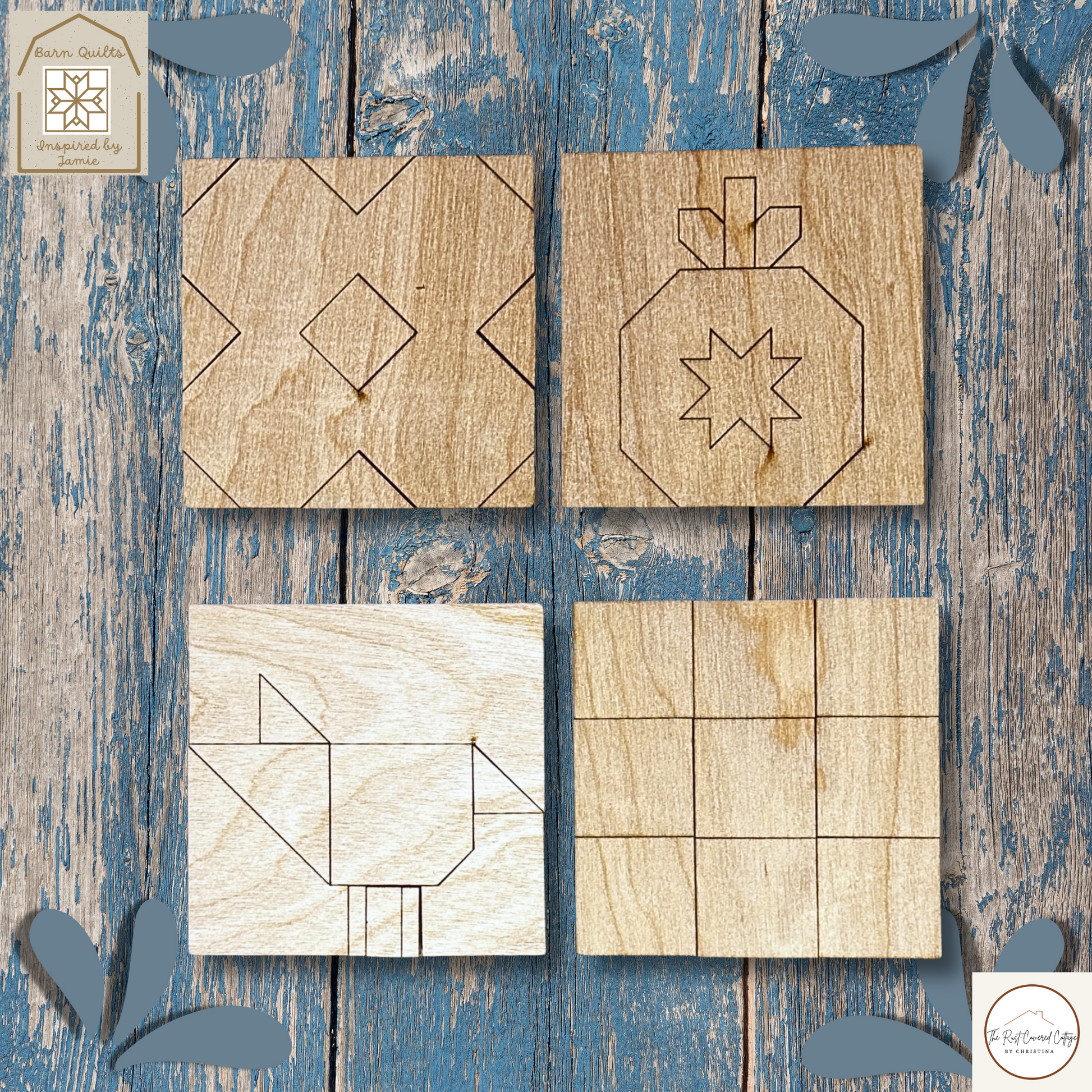 Add a rustic touch to your decor with our Mini Barn Quilt Block Set. This four-piece DIY kit includes classic quilt-inspired designs: Nine Patch, Pumpkin with Star, Crow, and Sunflower. Each block is precisely laser cut from 1/4" Birch wood and measures approximately 4.25" x 4.25".