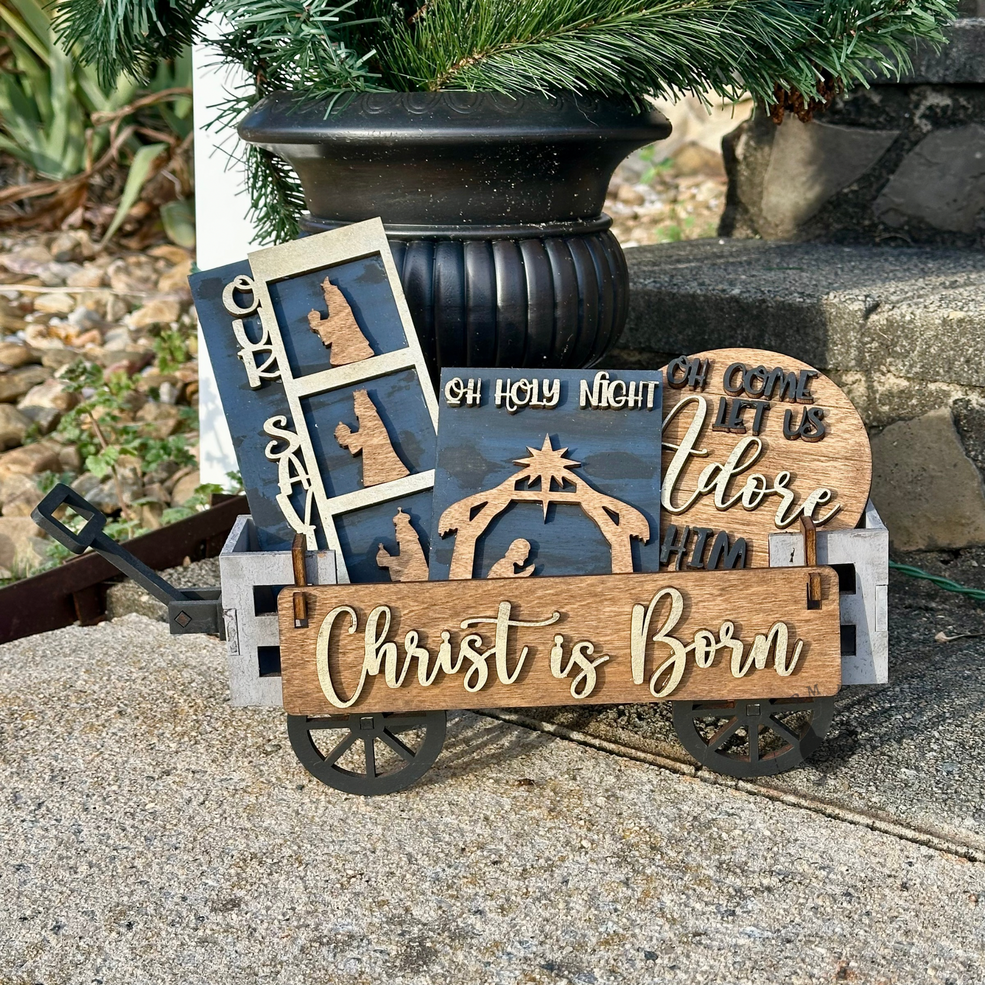 - Includes: “Christ Is Born” wagon panel topper, “Our Savior” panel, round “Oh Come Let Us Adore Him,” and “Oh Holy Night” nativity panel