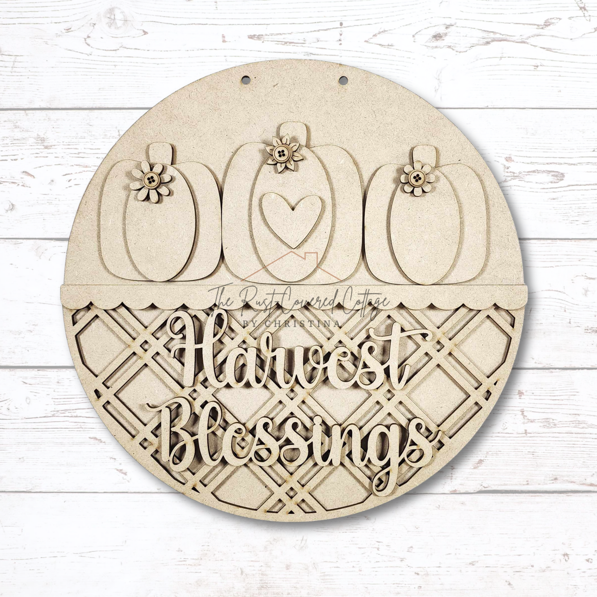 Celebrate the season with this Fall Harvest Door Hanger DIY Kit, available in two sizes and laser cut from 1/4" Birch. Featuring three layered pumpkins with floral accents and the phrase Harvest Blessings, this round design offers plenty of creative detail and dimension.