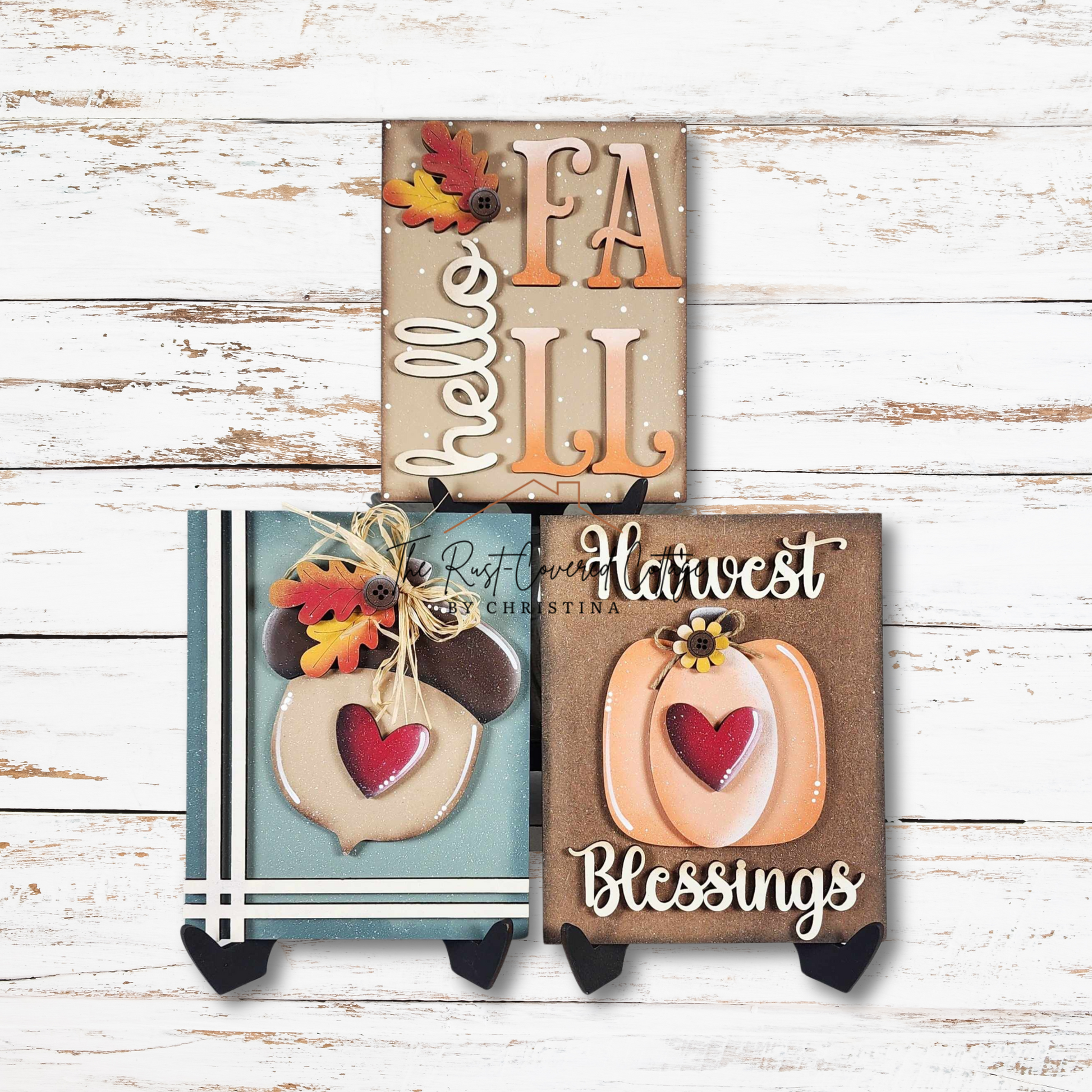 Designs include a playful “Hello Fall,” a heart-accented pumpkin with Harvest Blessings, and a coordinating acorn layered with leaves and detail cuts. Perfect for tiered trays, entryway shelves, craft booths, or gifting to a fellow DIY lover.