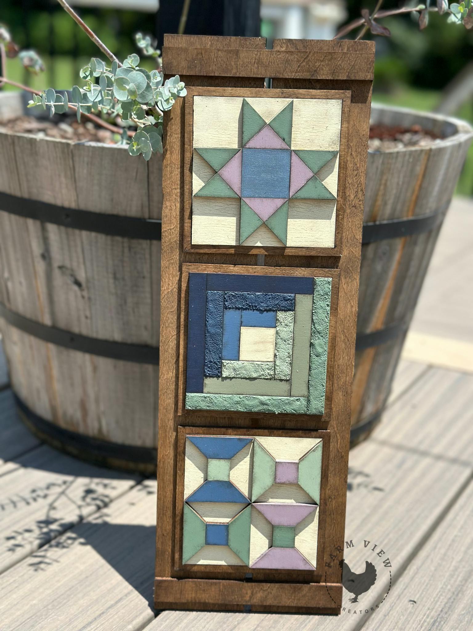 Each insert fits snugly behind a wooden shutter-inspired face, creating a farmhouse-style display that pairs beautifully with our mini signs, quilt blocks, and seasonal kits.