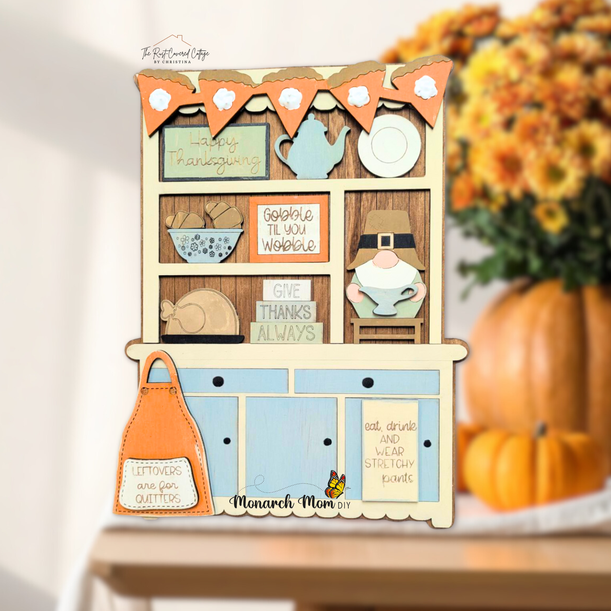 Celebrate gratitude with cozy charm using the Thanksgiving Hutch DIY wood kit—part of our Cottage Hutch Series. This laser-cut kit is crafted from layered 1/8" Birch and measures approximately 10" tall by 7.5" wide. It features playful Thanksgiving-inspired details, including a turkey, Pilgrim gnome, banner, and signs that say “Gobble ‘til You Wobble,” “Give Thanks Always,” and “Leftovers Are for Quitters.”