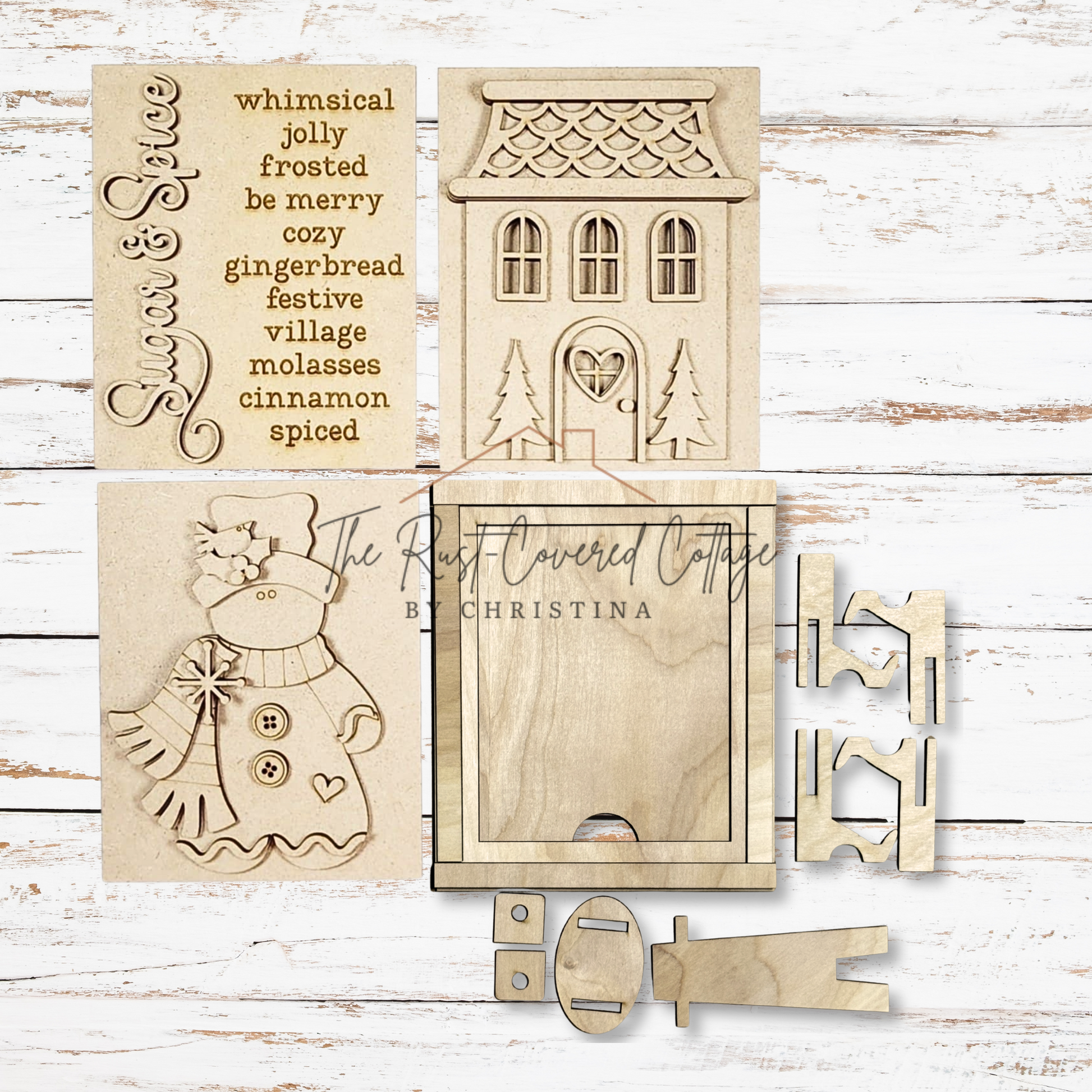 - 3 interchangeable signs: Gingerbread House, Snowman, and Sugar & Spice