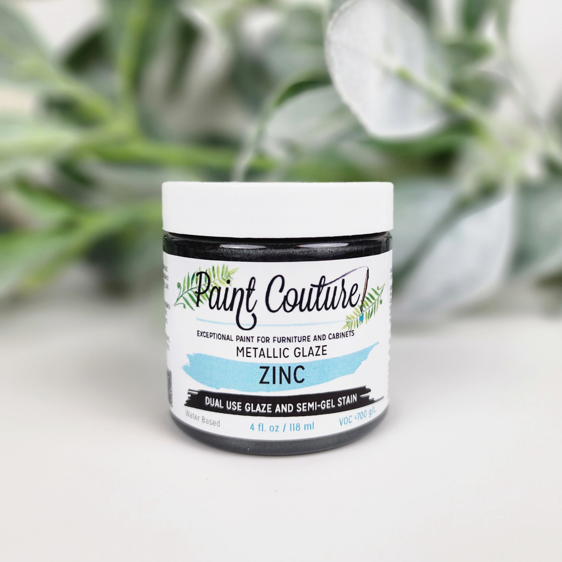 Zinc Metallic Glaze by Paint Couture is a deep, lustrous charcoal glaze that adds a striking metallic finish to your projects. This dual-use glaze and semi-gel stain is perfect for adding depth, dimension, and a touch of sophistication to furniture, cabinetry, and decorative pieces. Easy to apply with a brush, roller, or applicator, it enhances details and textures beautifully. Water-based, low VOC, and made in the USA.